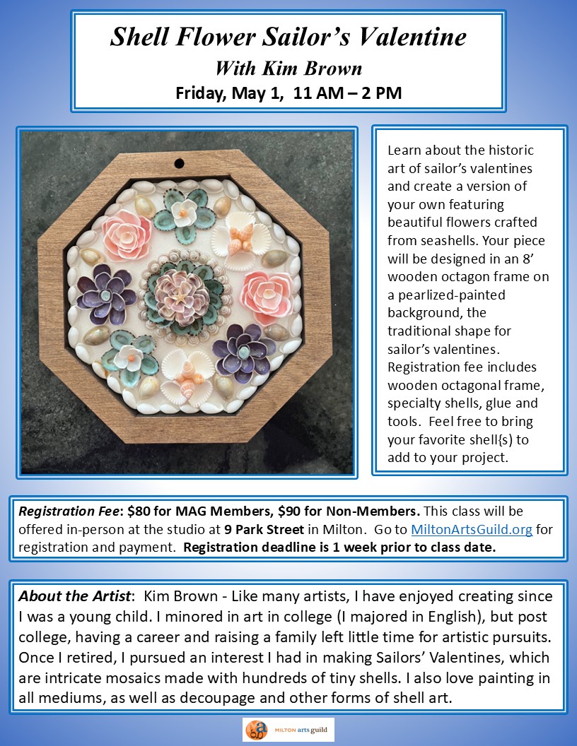 Learn about the historic art of sailor’s valentines and create a version of your own featuring beautiful flowers crafted from seashells. Your piece will be designed in an 8’ wooden octagon frame on a pearlized-painted background, the traditional shape for sailor’s valentines. Registration fee includes wooden octagonal frame, specialty shells, glue and tools. Feel free to bring your favorite shell(s) to add to your project.