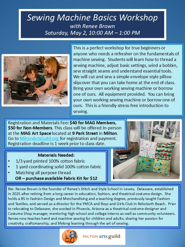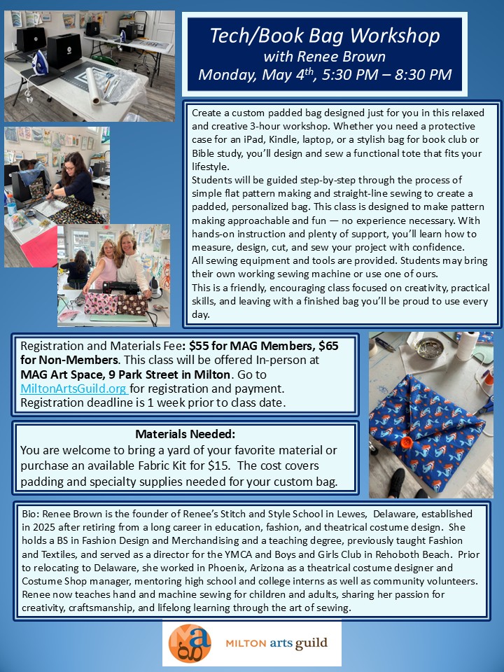 Location: Class will be offered in person, at MAG ArtSpace, 9 Park Street, Milton DE. Students are only permitted to park in spaces designated for Milton Arts Guild.