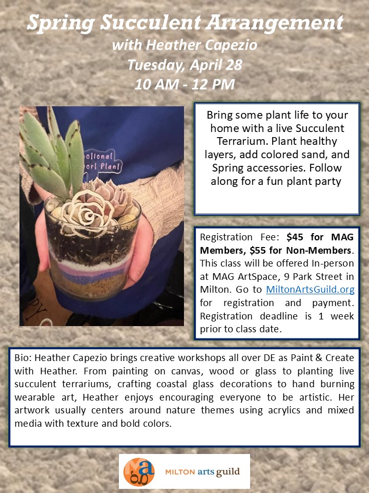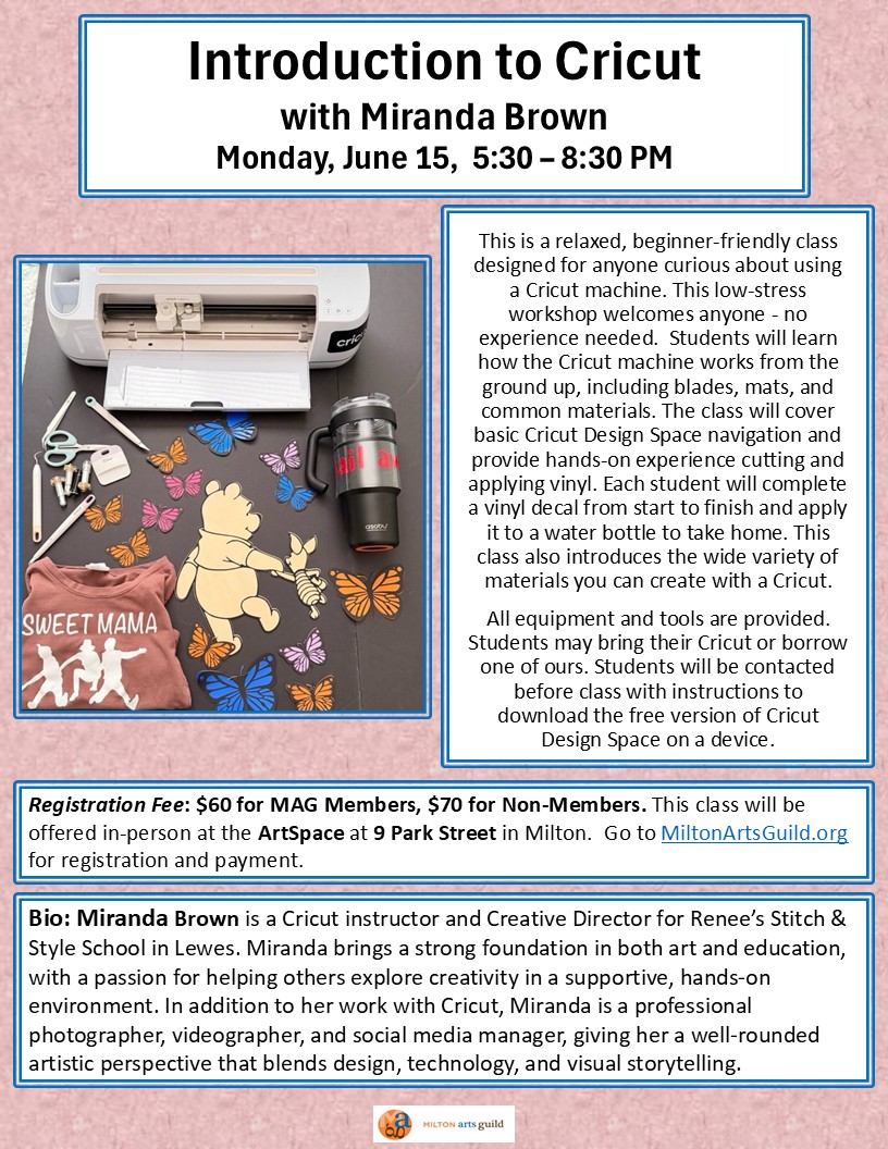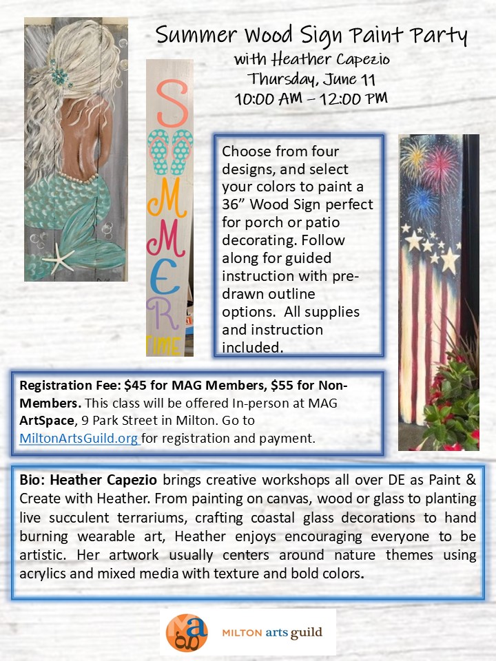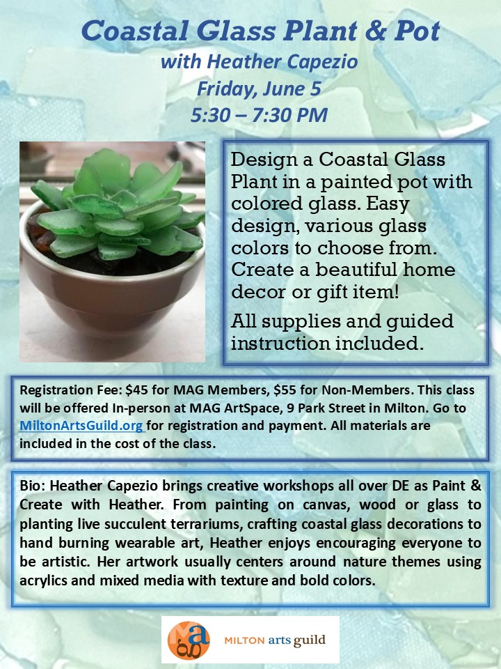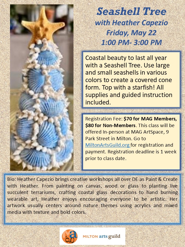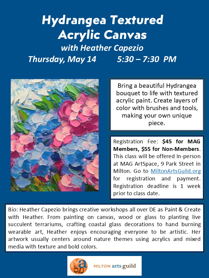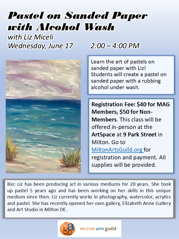 Location: Class will be offered in person, at MAG ArtSpace, 9 Park Street, Milton DE.