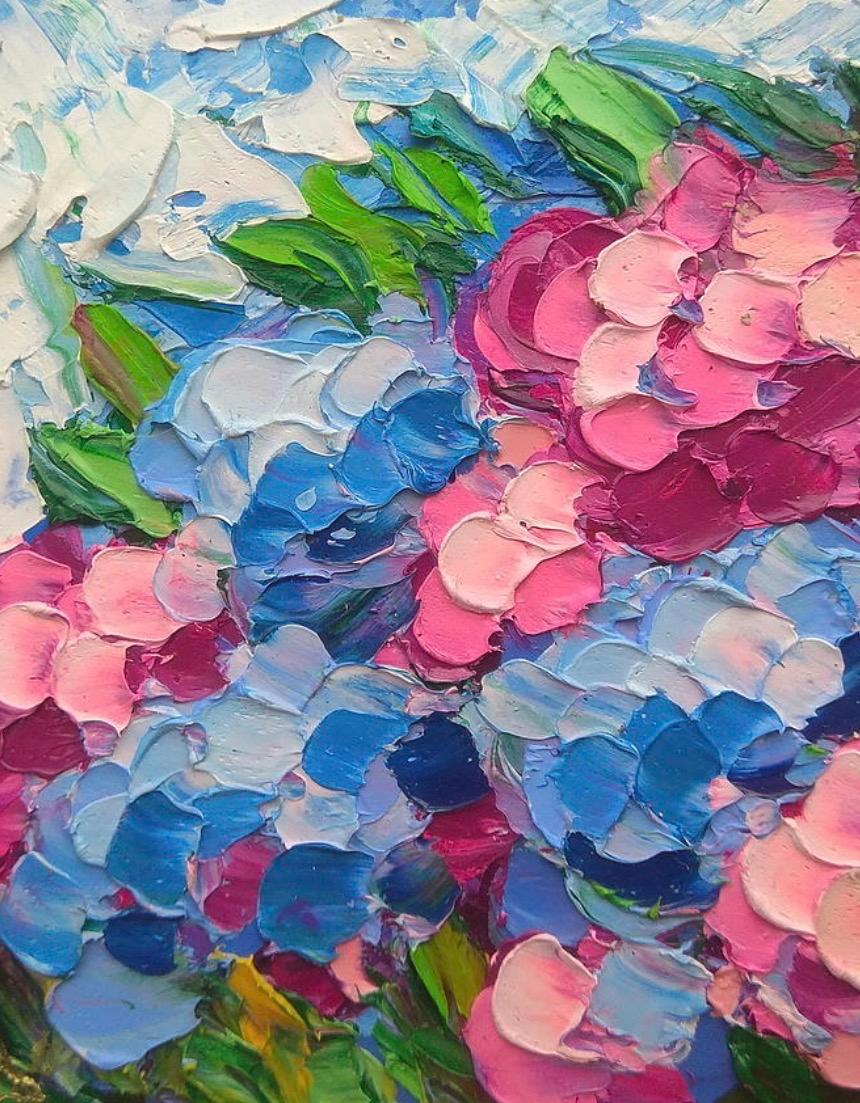 Bring a beautiful Hydrangea bouquet to life with textured acrylic paint. Create layers of color with brushes and tools, making your own unique piece.