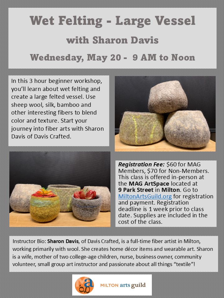 In this 3 hour beginner workshop, you’ll learn about wet felting and create a large felted vessel. Use sheep wool, silk, bamboo and other interesting fibers to blend color and texture. Start your journey into fiber arts with Sharon Davis of Davis Crafted.