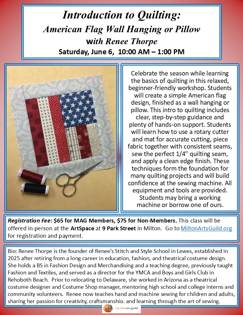Celebrate the season while learning the basics of quilting in this relaxed, beginner-friendly workshop. Students will create a simple American flag design, finished as a wall hanging or pillow. This intro to quilting includes clear, step-by-step guidance and plenty of hands-on support. Students will learn how to use a rotary cutter and mat for accurate cutting, piece fabric together with consistent seams, sew the perfect 1/4" quilting seam, and apply a clean edge finish. These techniques form the foundation for many quilting projects and will build confidence at the sewing machine. All equipment and tools are provided. Students may bring a working machine or borrow one of ours. Teens are welcome, but students under the age of 16 must be accompanied with a parent or guardian.